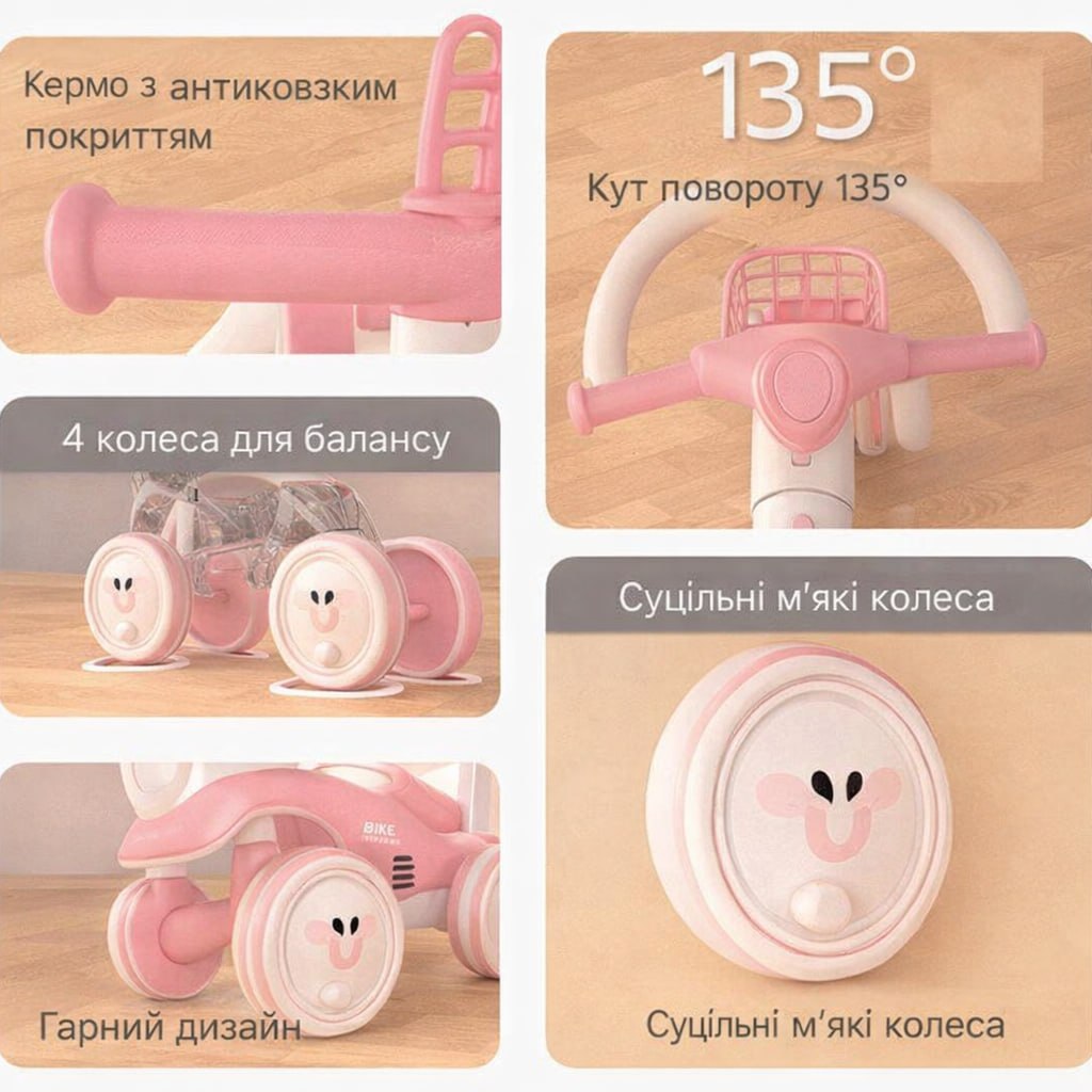 Кожна деталь розроблена з турботою про безпеку та комфорт дитини. Протиковзаючі ручки, широкі колеса та стійка рама - ідеальний перший транспорт