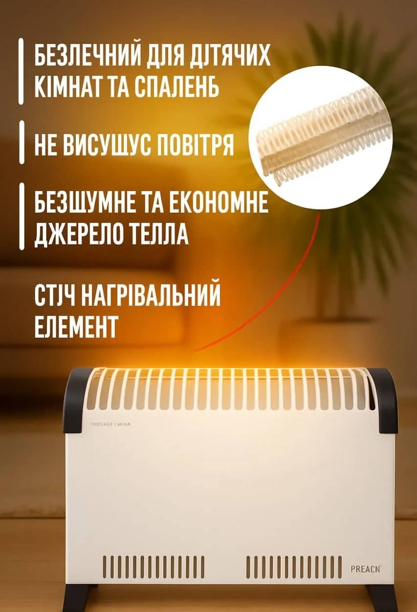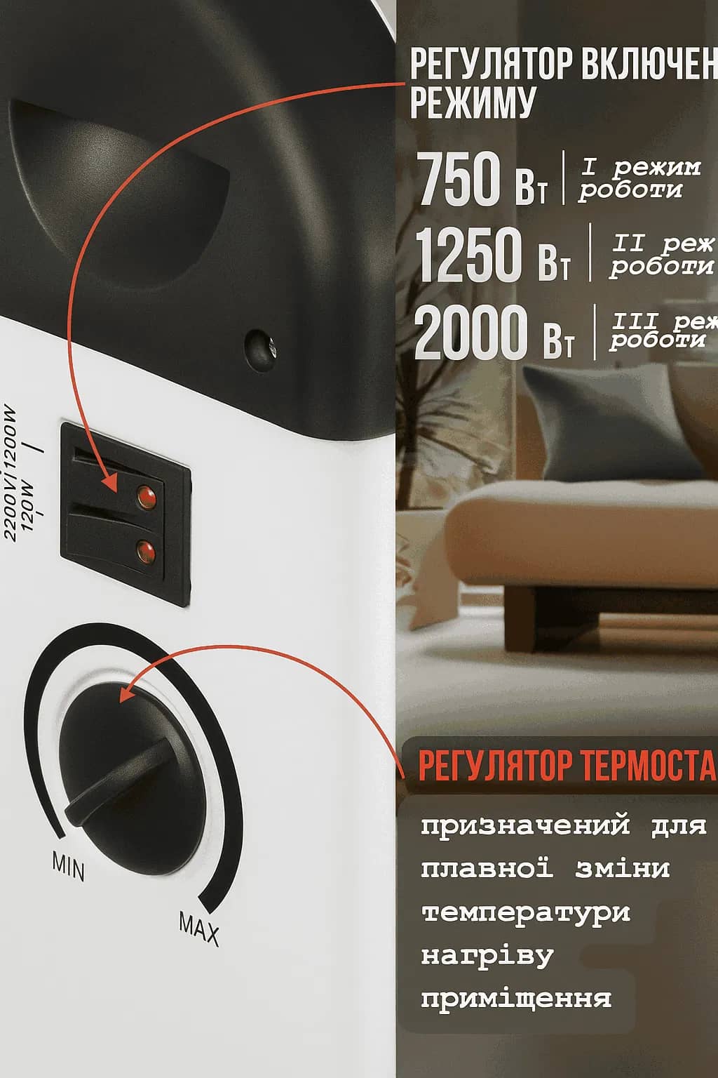 - Режими роботи: 750 Вт, 1250 Вт, 2000 Вт