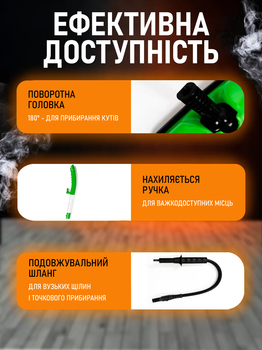 Серед них є спеціальна насадка для чищення килимів, яка ефективно видаляє бруд та пил.