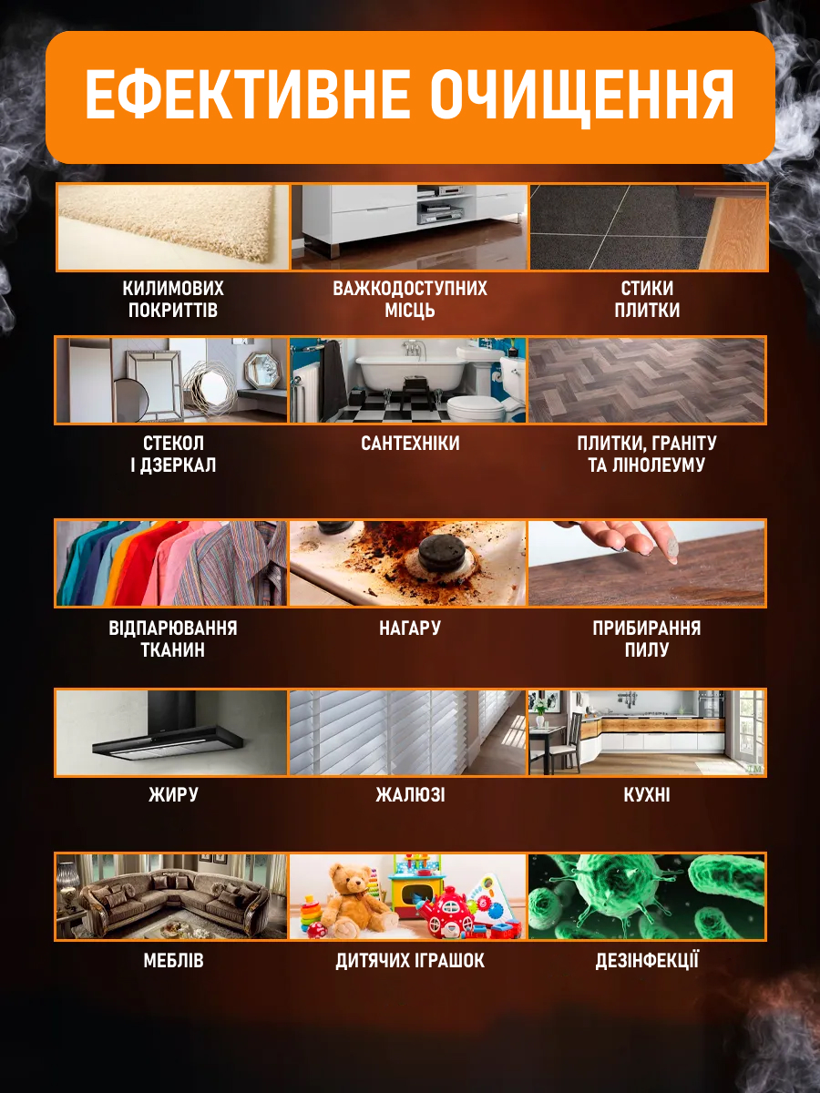 Завдяки сучасній технології пароочистки, вона забезпечує глибоке очищення поверхонь без необхідності використання хімічних засобів.
