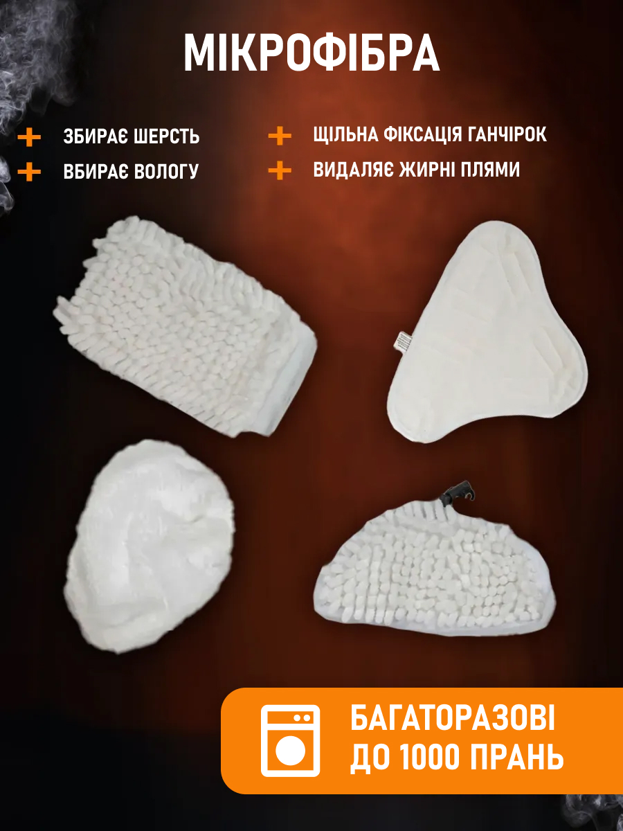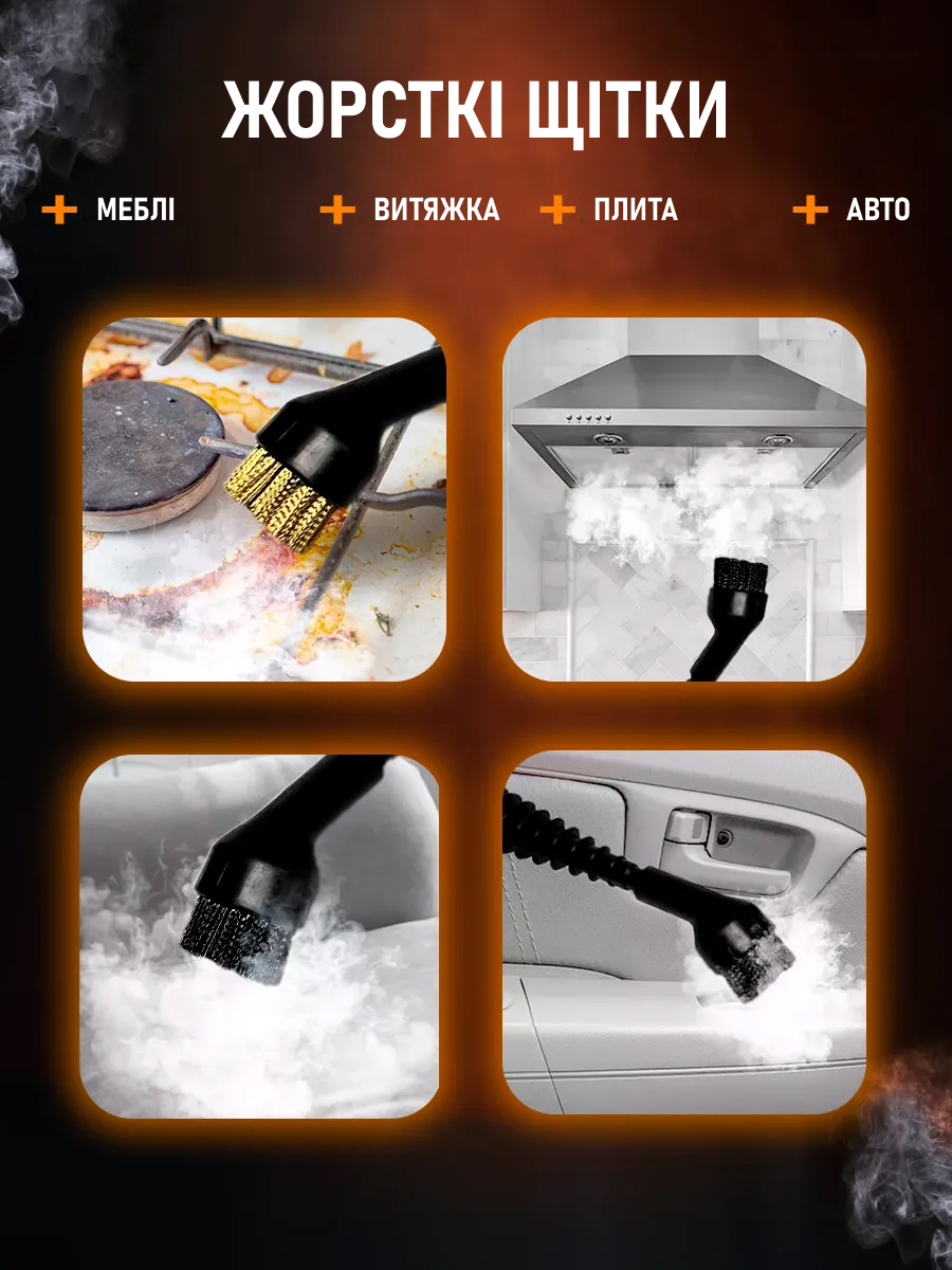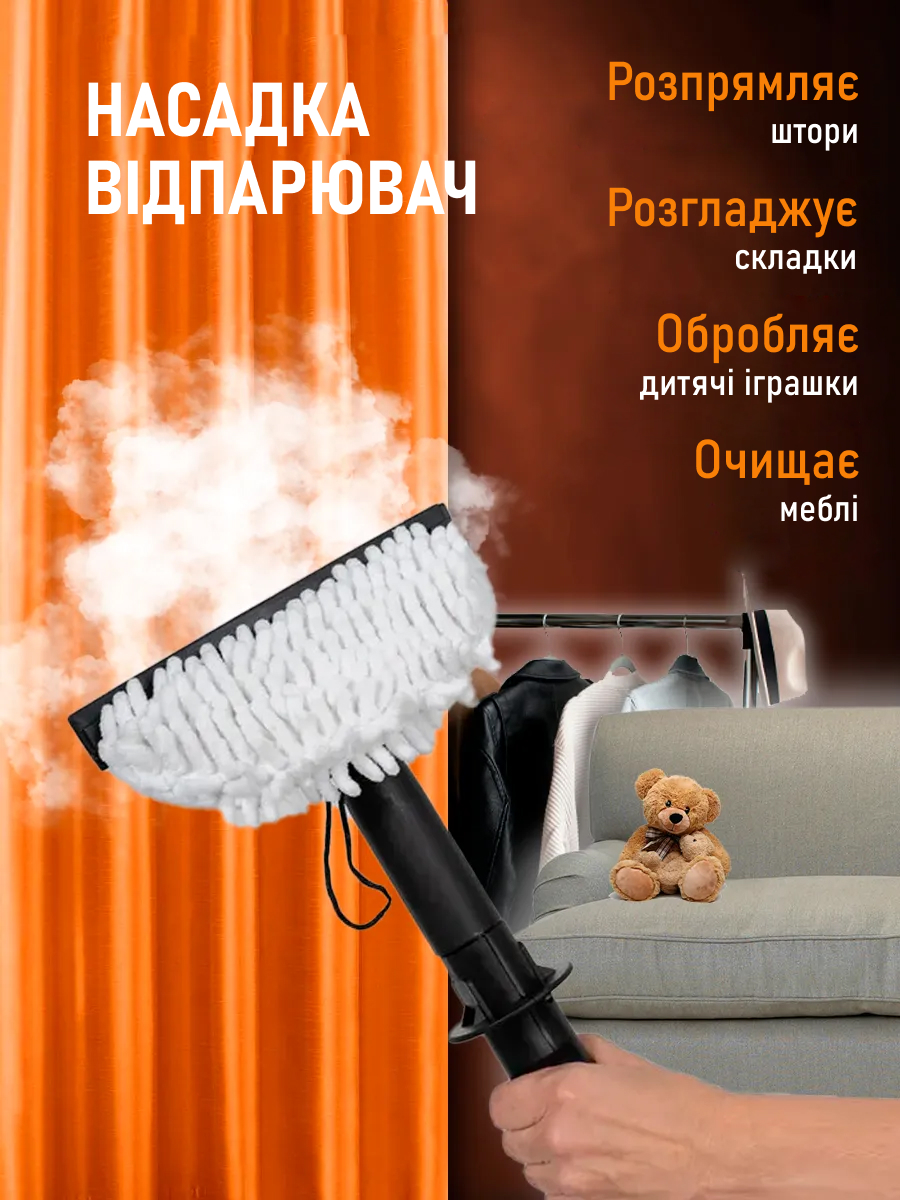 Парова швабра комплектується 6 насадками для різних завдань, що розширює її функціональність