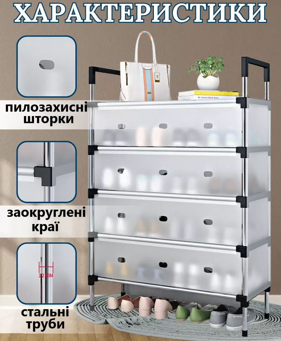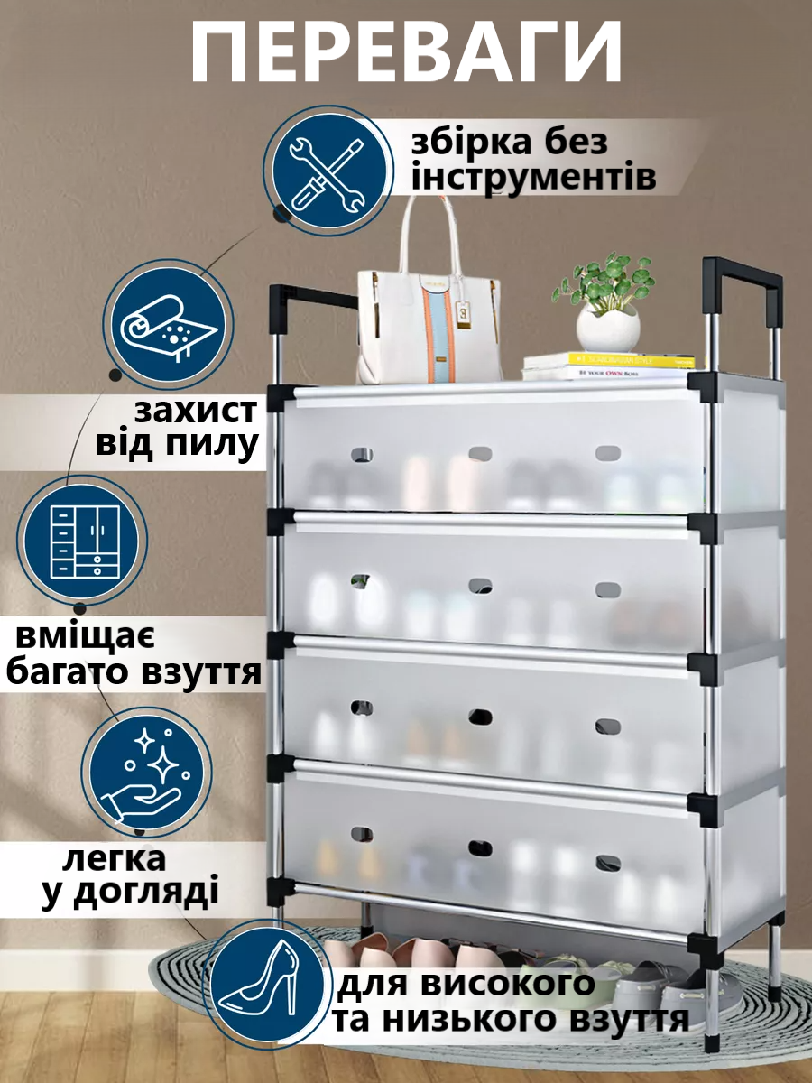 - Призначення: Для зберігання взуття вдома, у передпокої, гардеробній або офісі