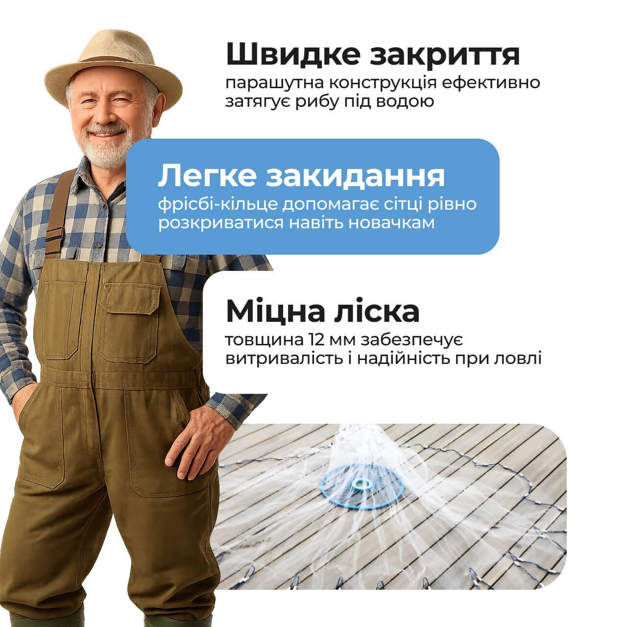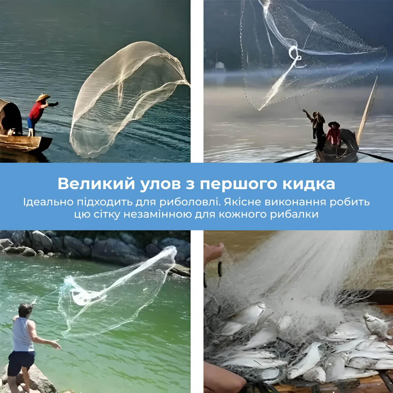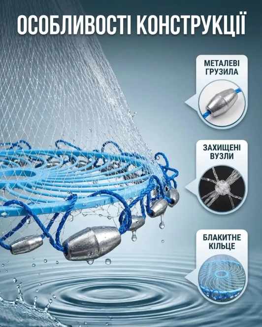 Кастингова сітка - це купол, який при закиданні швидко накриває рибу у вибраній зоні, забезпечуючи ефективний та швидкий улов. Підходить як для початківців, так і для досвідчених рибалок.