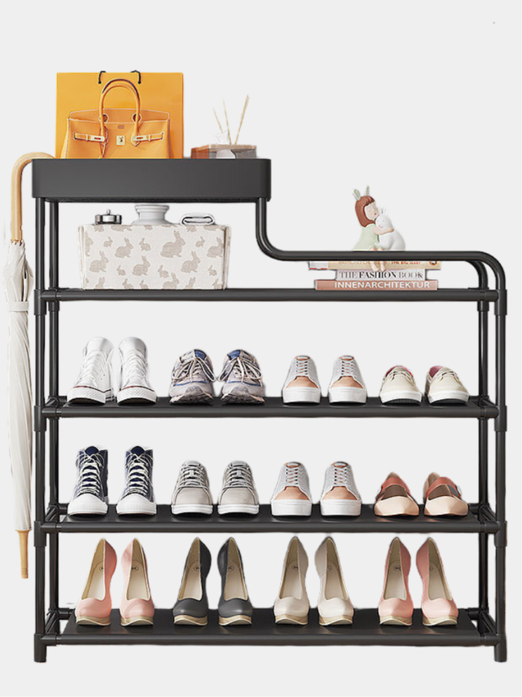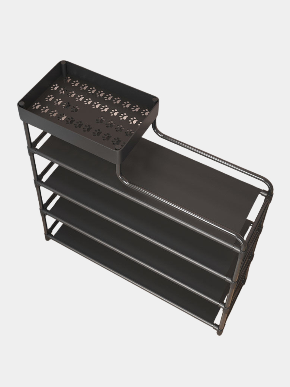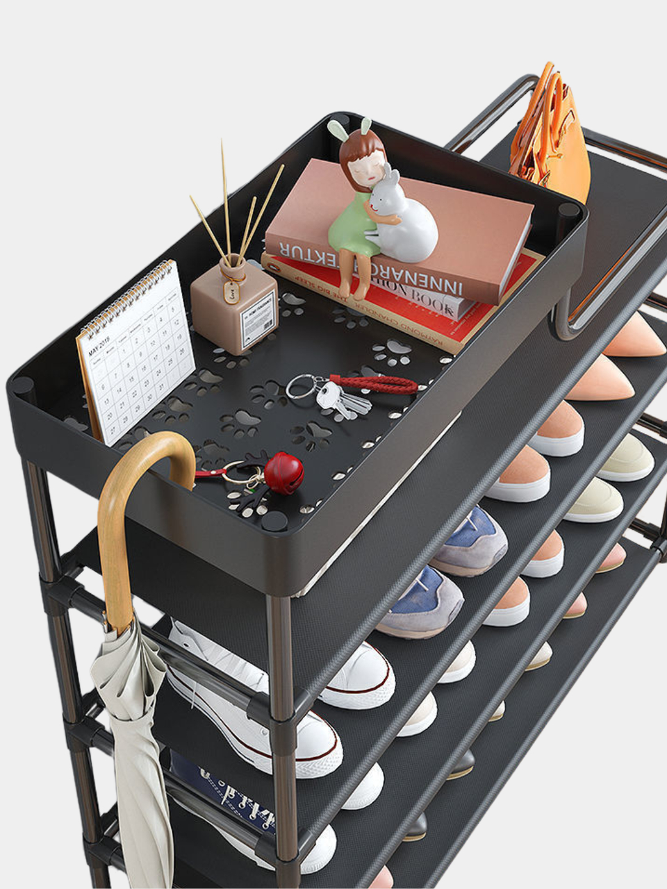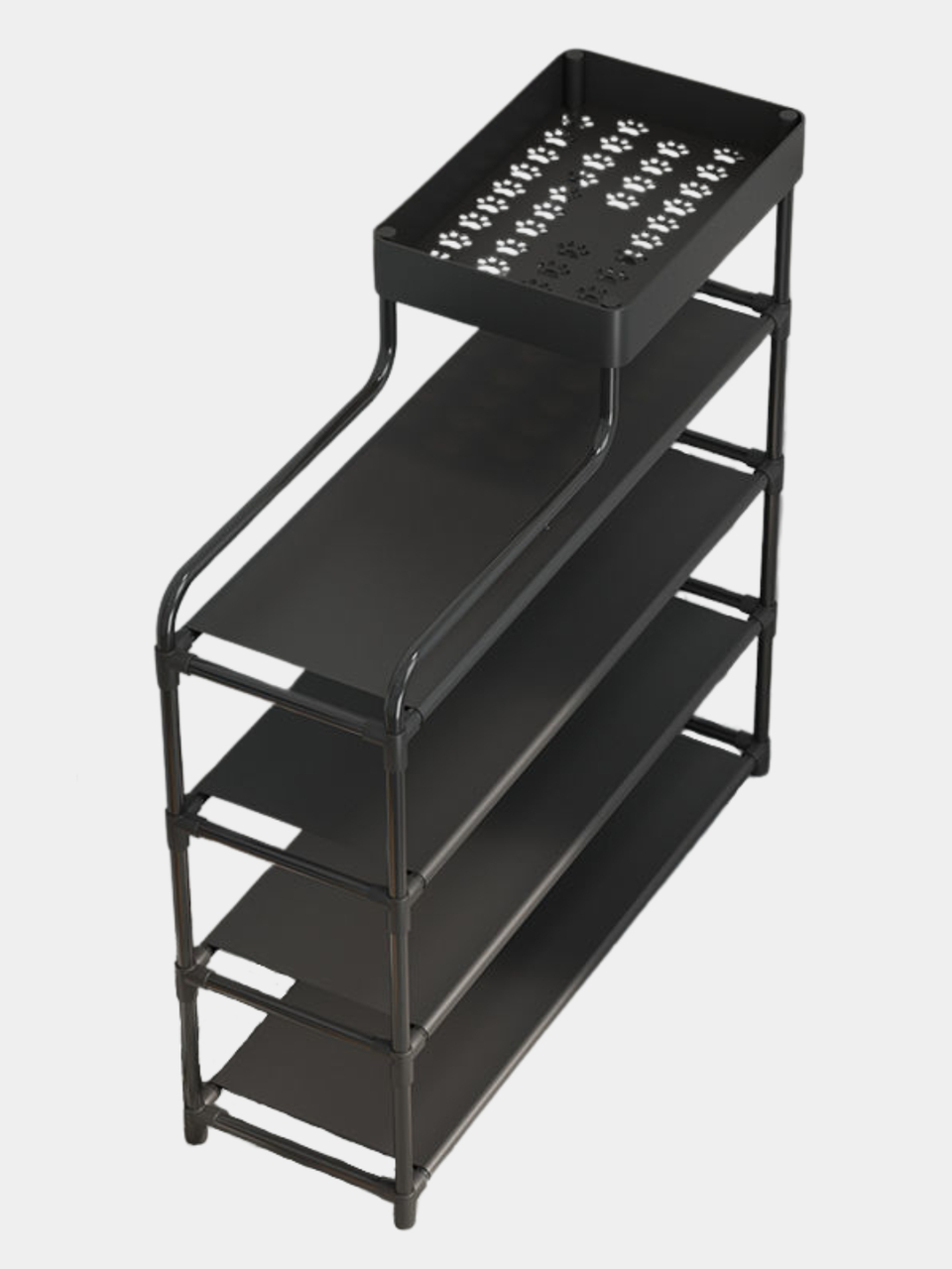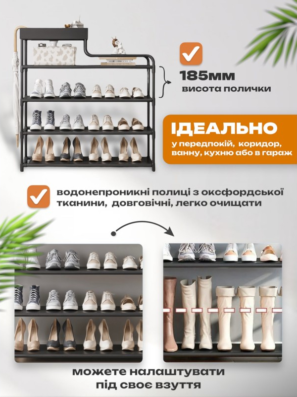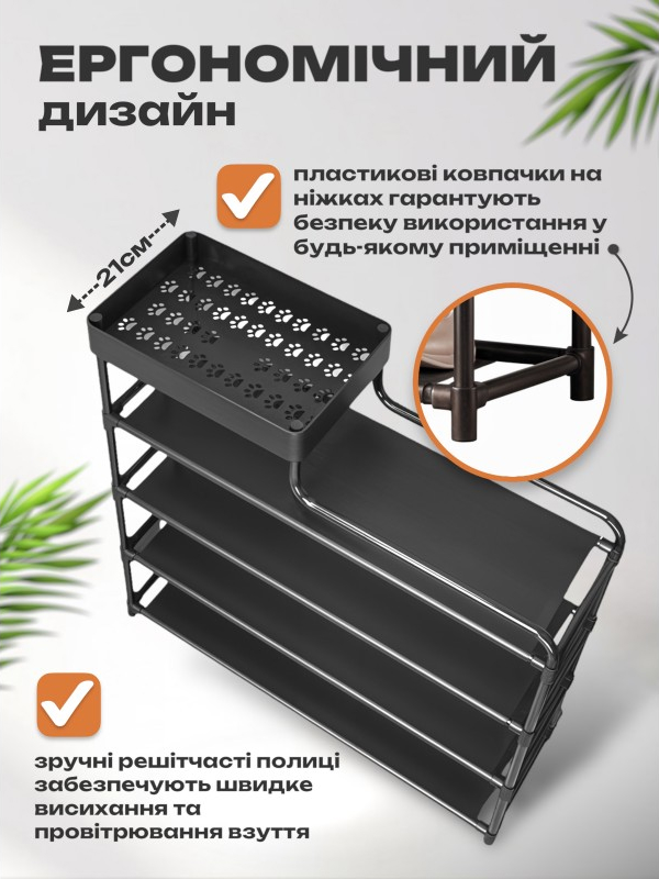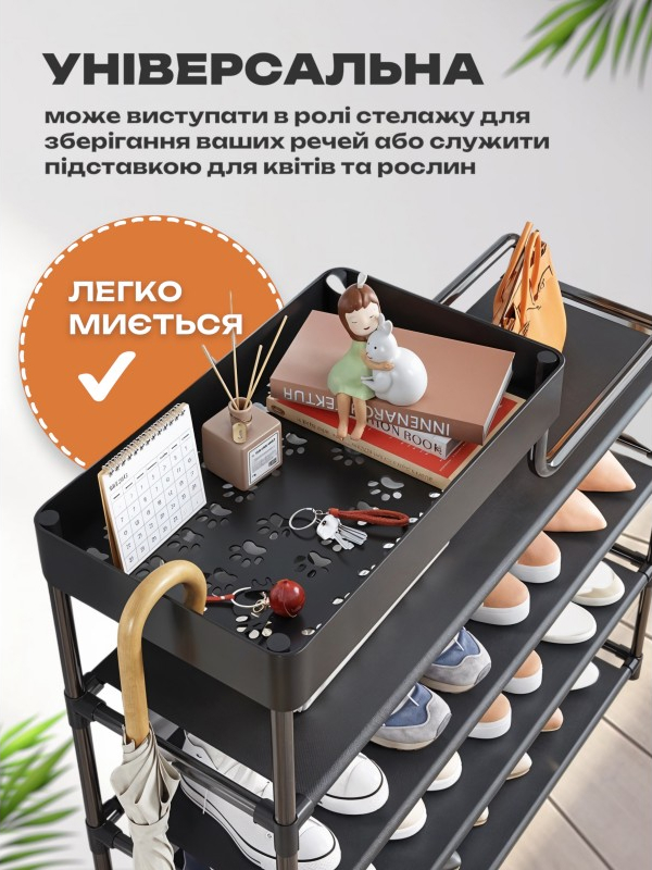 Ця універсальна полиця не тільки ідеально підходить для взуття, але й може використовуватися для зберігання інших речей або в якості стелажа для квітів і рослин. Вона стане чудовим доповненням до будь-якого інтер'єру завдяки своєму чорному кольору та простому дизайну, який легко впишеться в різні стилі